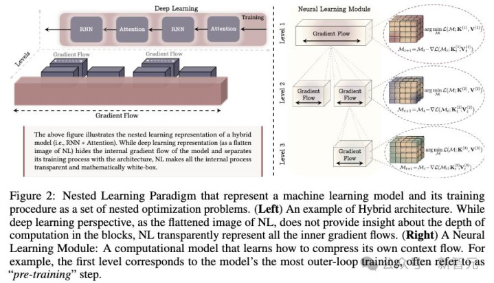 也就是说「嵌套学习」不再将机器学习模型视作一种单一、连续的过程,而是一个由多层相互关联的优化问题组成的系统,这些问题同时进行优化。
