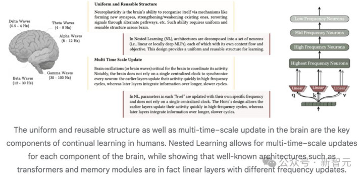 嵌套学习模型中的统一结构与多频率更新机制,与人脑的神经波动与神经可塑性结构十分相似。