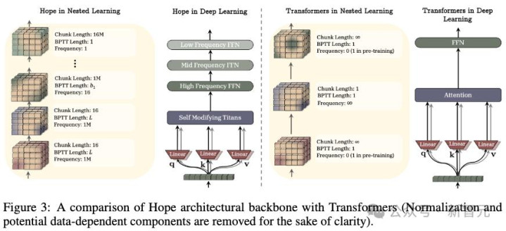 换言之,Hope可以通过自指过程优化自身记忆,形成具有无限嵌套学习层级的架构。