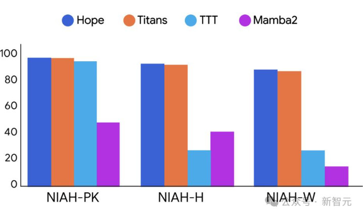 研究人员基于以上嵌套学习原则设计了「Hope」模型,它是「Titans架构」的改进版本。