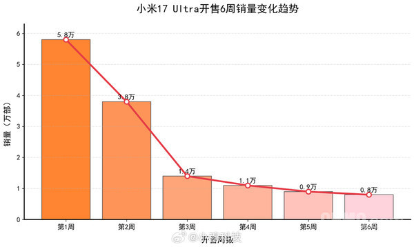 具体来看,2026年第1周,小米17Ultra的销量达到5.8万台。然而,从第二周开始,销量便一路下滑。第二周销量降至3.8万台,第三周进一步下滑至1.4万台,第四周为1.1万台,第五周仅0.9万台,到了第六周,销量更是低至0.8万台。