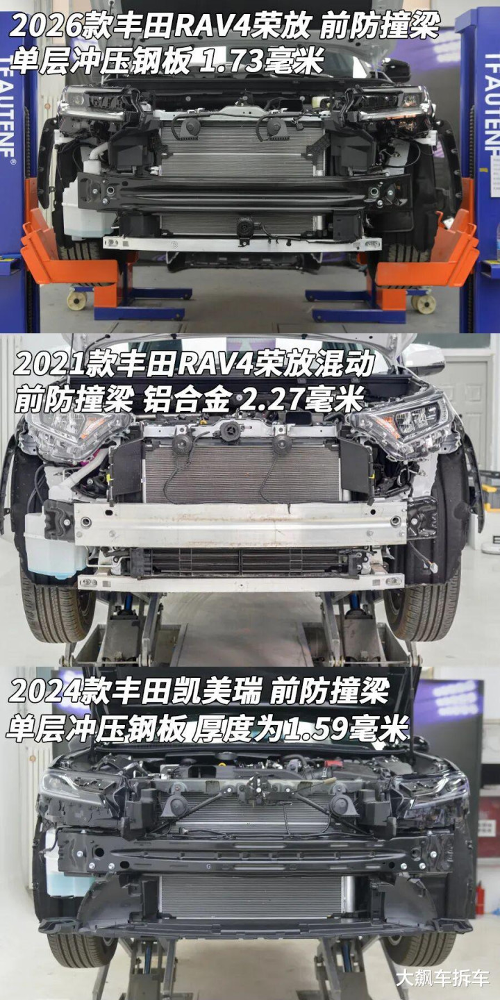 拆掉前保险杠,能看到一根单层冲压钢板前防撞梁,厚度为1.73毫米,能覆盖车头的79.23%。不过,老款RAV4的前防撞梁是铝合金材质,明显降本增效了,这辆车倒是和凯美瑞的防撞梁比较相似。