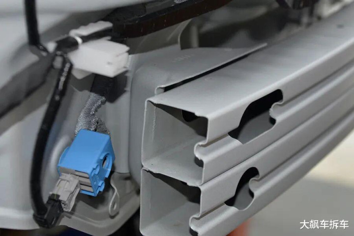 这辆车的副防撞梁与老款一样,都是口字形截面的铝合金梁,并且配备了带有溃缩褶皱的吸能盒。