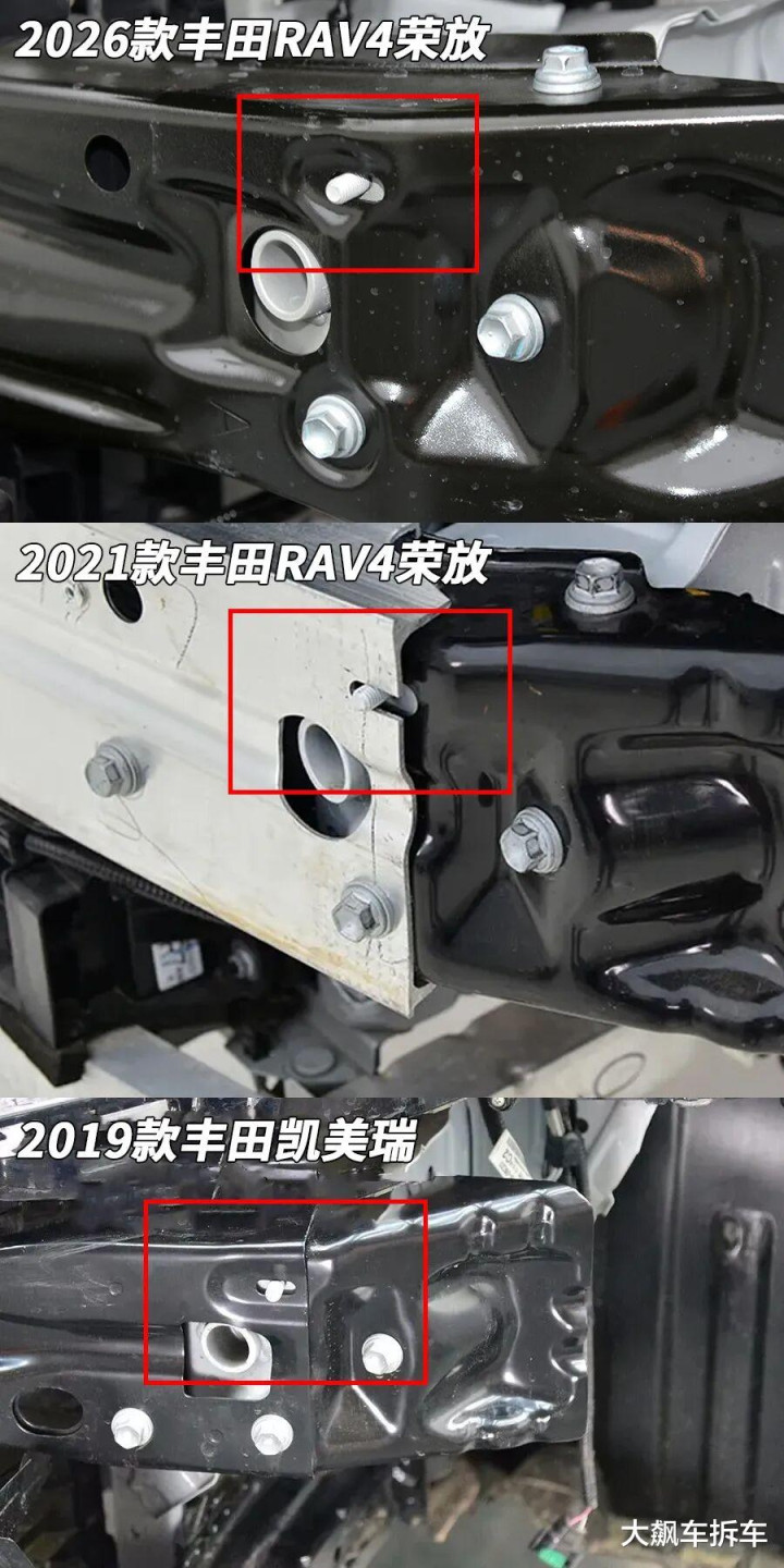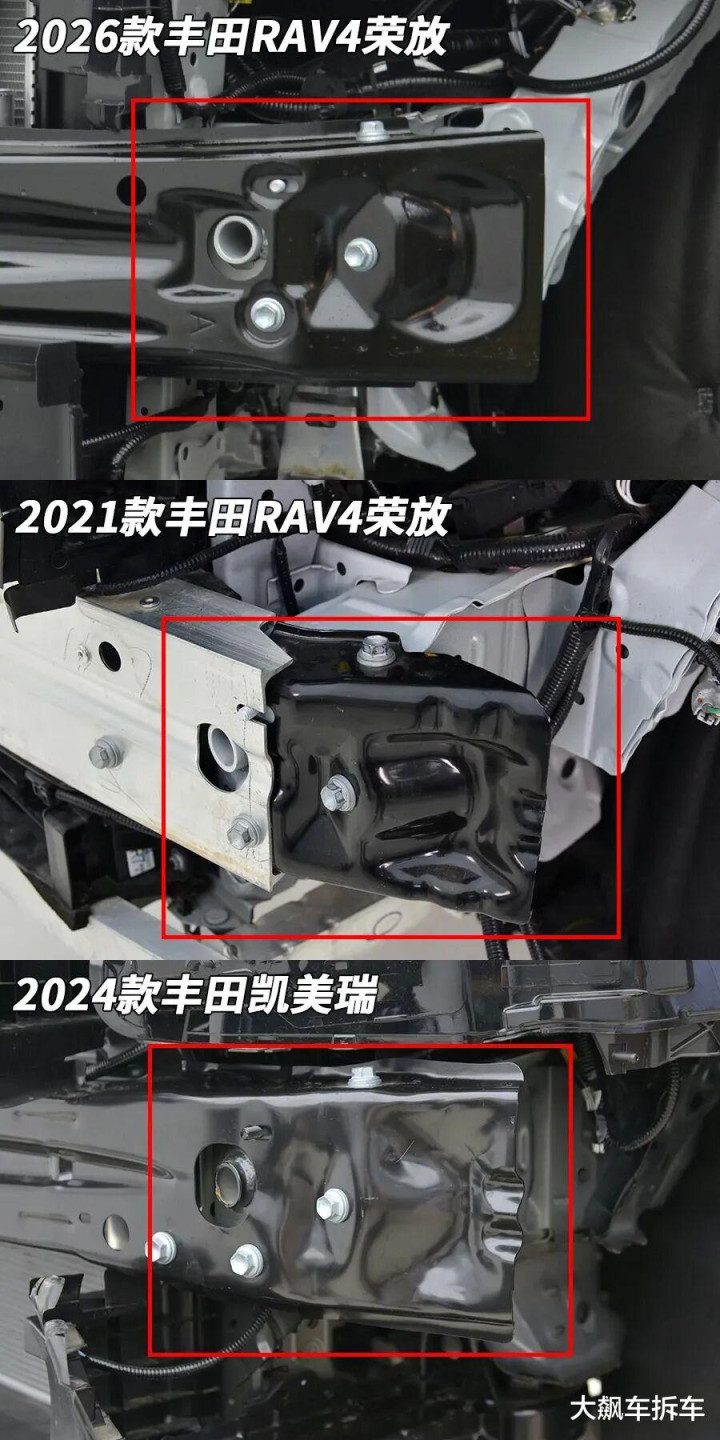 与老款RAV4一样,这辆车也没有独立的吸能盒,只是纵梁前部设计有溃缩褶皱。如果发生碰撞,纵梁发生变形,会影响到日后的使用强度和二手残值。
