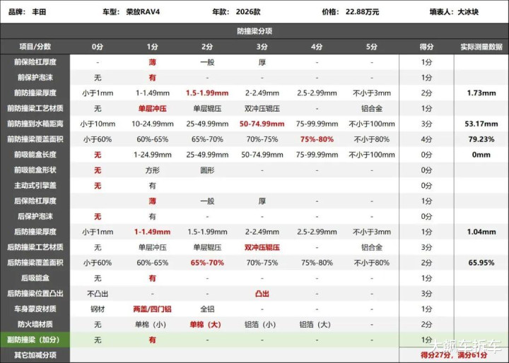 2026款丰田荣放RAV4防撞梁评分