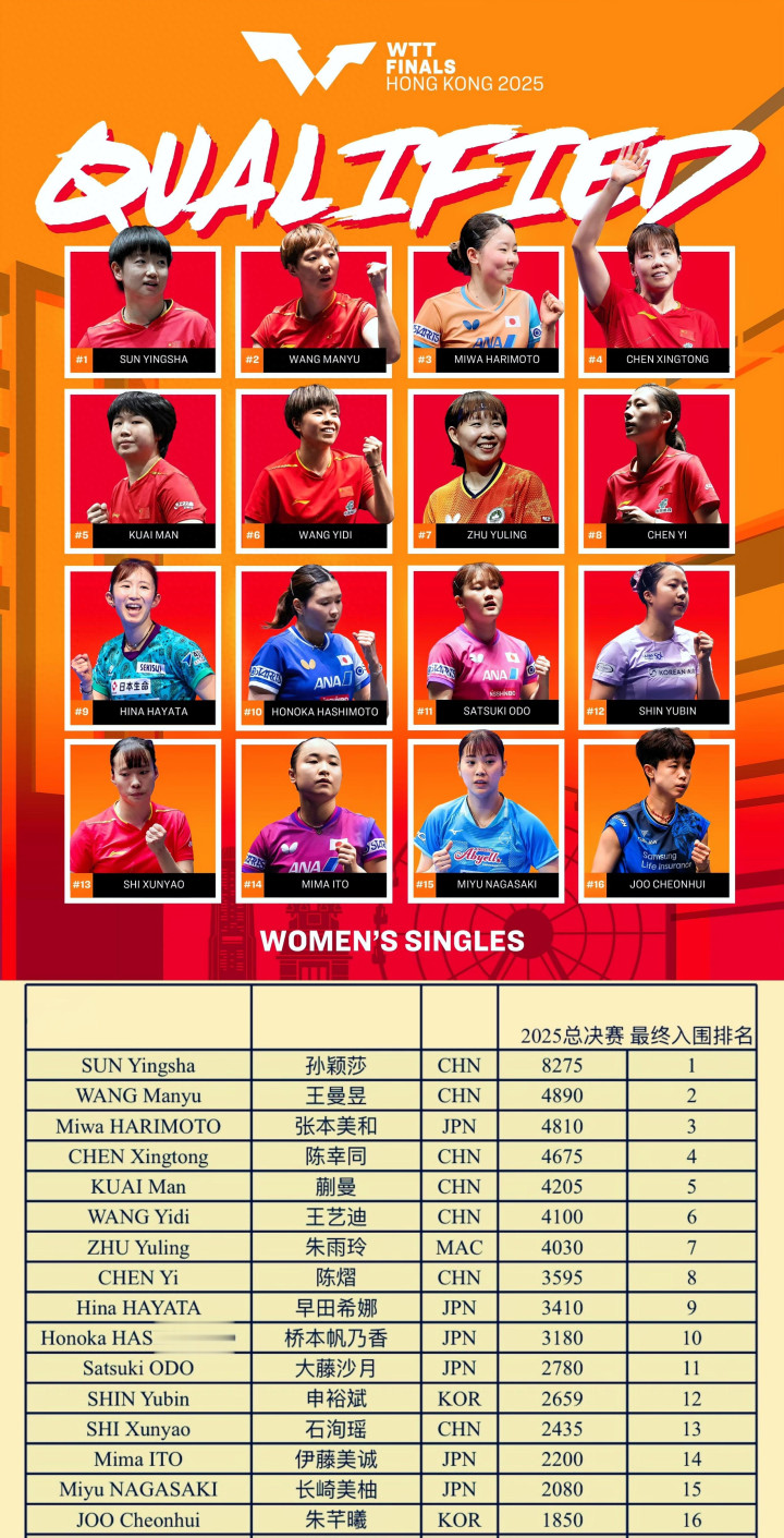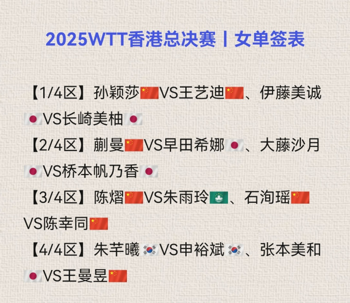 北京时间12月8日下午,2025WTT香港年度总决赛女单签表出炉!本届香港总决赛女单16名选手,全部是来自东亚,中国、日本、韩国和中国澳门包揽全部席位。因此,本站比赛从头到尾的核心主题就是“德比”二字!