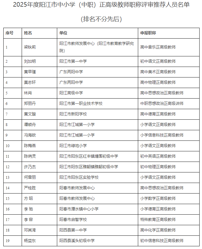 附件:2025年度阳江市中小学(中职)正高级教师职称评审推荐人员名单