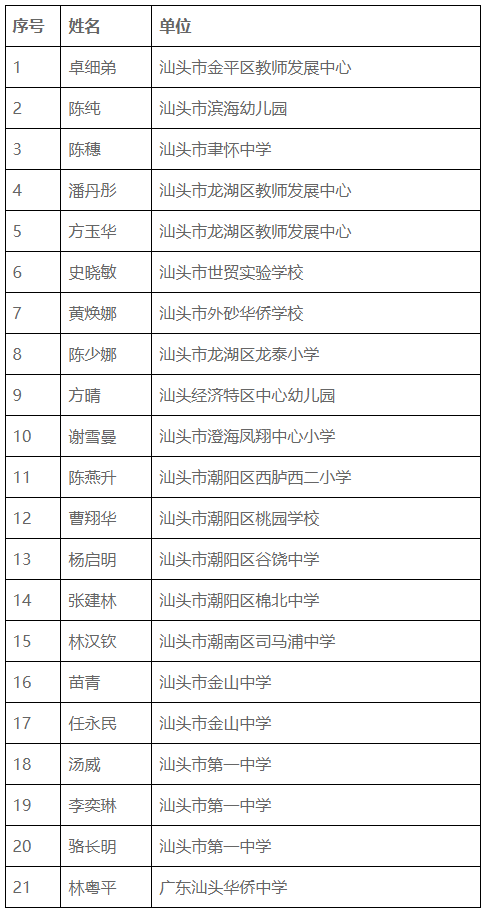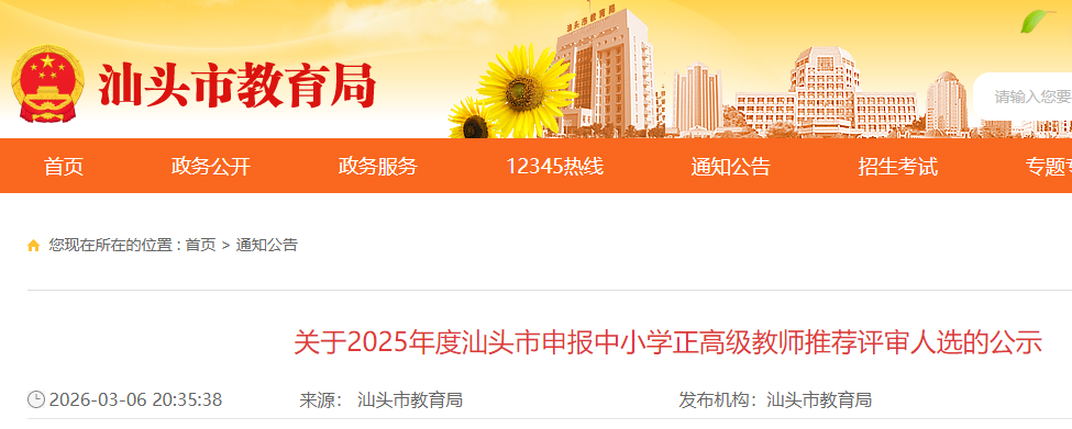 根据《广东省教育厅关于做好2025年度中小学教师职称评审工作的通知》要求,现对2025年度汕头市申报中小学正高级教师推荐评审人选予以公示如下: